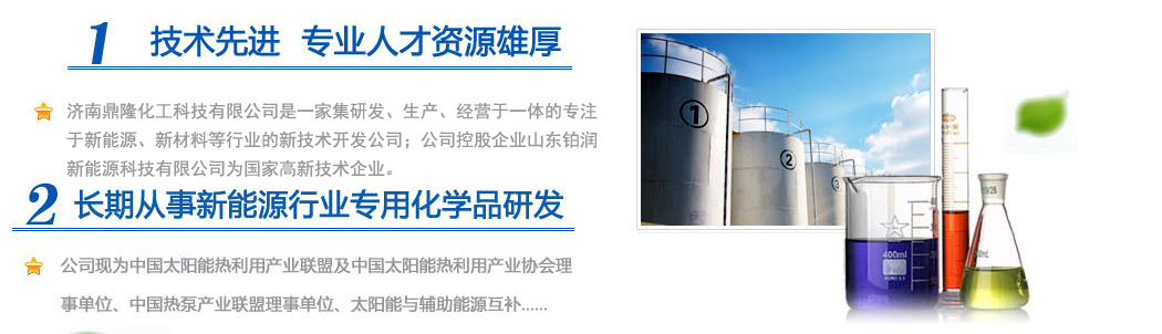 濟(jì)南鼎隆化工科技有限公司是一家集研發(fā)、生產(chǎn)、經(jīng)營(yíng)于一體的專(zhuān)注于新能源、新材料等行業(yè)的新技術(shù)開(kāi)發(fā)公司;公司控股企業(yè)山東鉑潤(rùn)新能源科技有限公司為國(guó)家高新技術(shù)企業(yè)。擁有雄厚的科研實(shí)力和專(zhuān)業(yè)銷(xiāo)售隊(duì)伍以及多名從事化學(xué)化工專(zhuān)業(yè)的高素質(zhì)人員,其中博士生導(dǎo)師1人,碩士研究生3人。公司現(xiàn)為中國(guó)太陽(yáng)能熱利用產(chǎn)業(yè)聯(lián)盟及中國(guó)太陽(yáng)能熱利用產(chǎn)業(yè)協(xié)會(huì)理事單位、中國(guó)熱泵產(chǎn)業(yè)聯(lián)盟理事單位、山東清潔能源供暖產(chǎn)業(yè)聯(lián)盟理事單位、太陽(yáng)能與輔助能源互補(bǔ)供熱/制冷工程專(zhuān)業(yè)委員會(huì)會(huì)員單位。公司專(zhuān)注于綠色科技,專(zhuān)業(yè)化研發(fā)環(huán)境友好型化工產(chǎn)品,與眾多高校和國(guó)內(nèi)外多家著名化學(xué)品公司保持戰(zhàn)略合作關(guān)系。公司擁有“載能”和“澤能”...更多